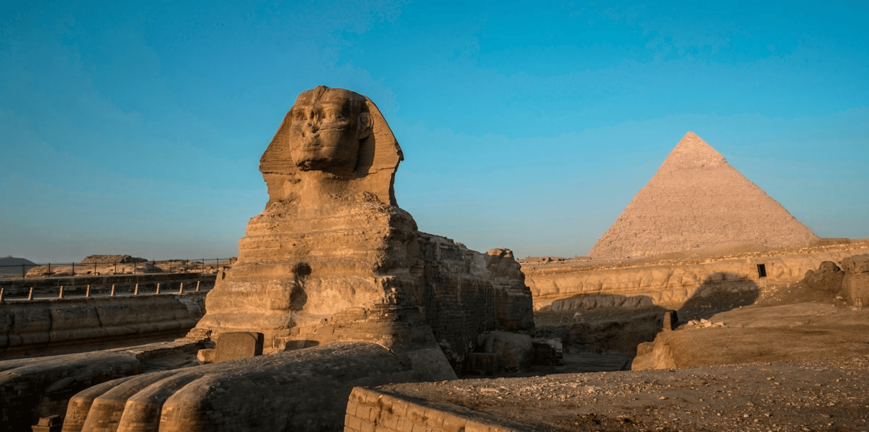 The pyramid complex also includes the Great Sphinx, believed to represent the face of Pharaoh Khafre.