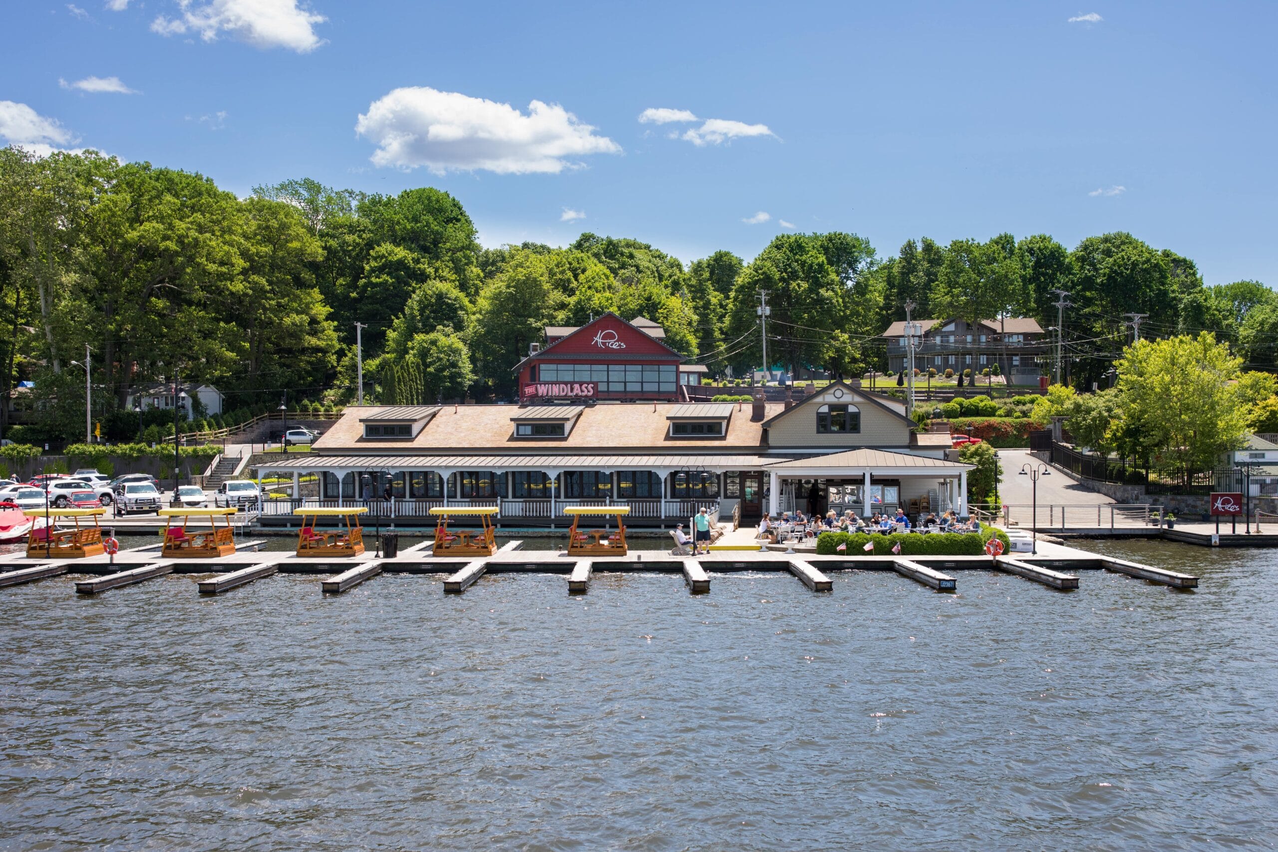 The Windlass is one of the most iconic hopatcong lake restaurants, located at 45 Nolan’s Point Park Rd, right on the water’s edge. This spacious lakeside venue features indoor dining, an open-air porch, and deck seating that feels almost floating above the lake, enhanced by nautical décor and a distinctive boat-shaped bar.