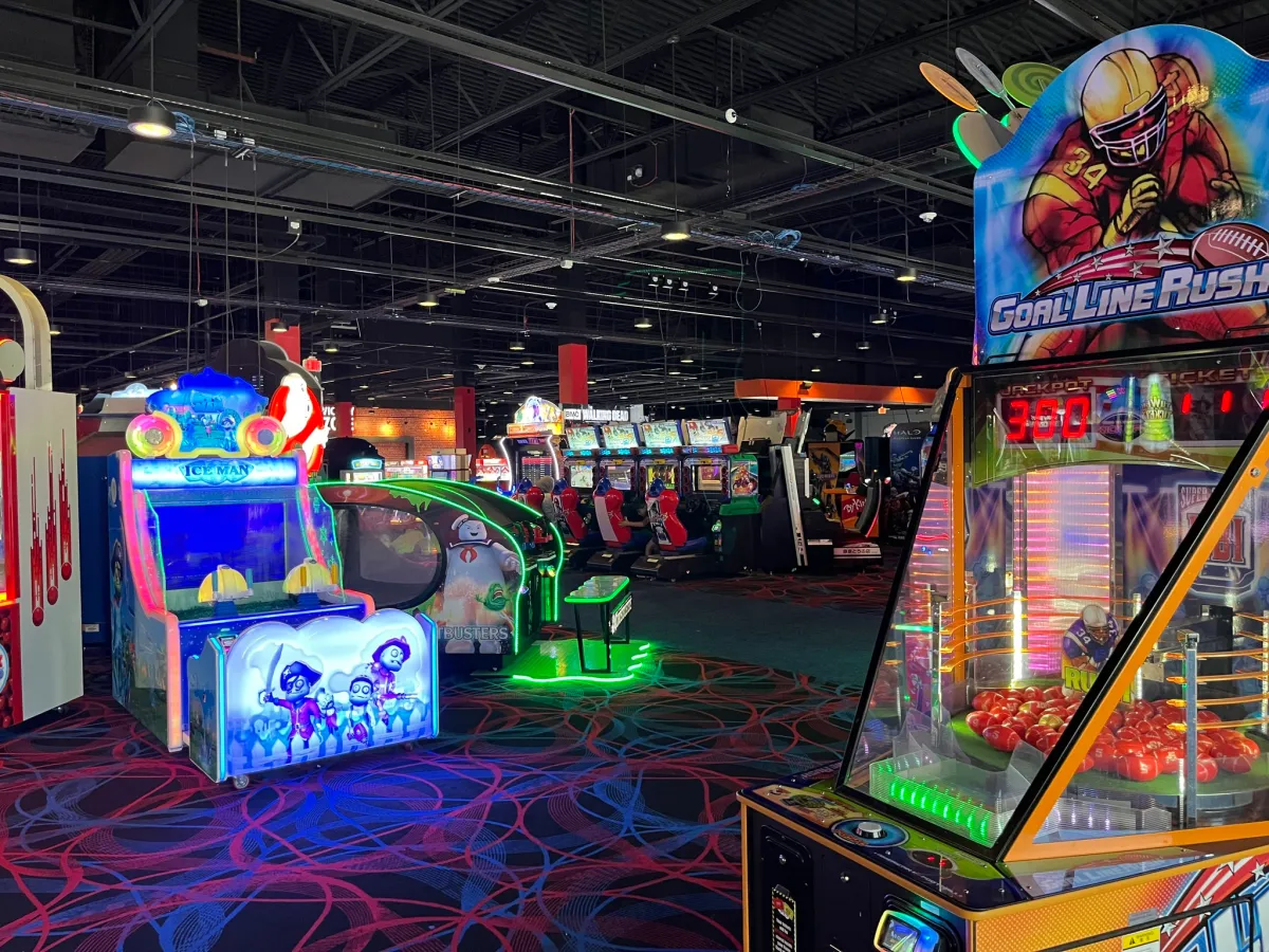 The facility includes arcade machines, bowling, and a small indoor playground section with slides and tunnels.